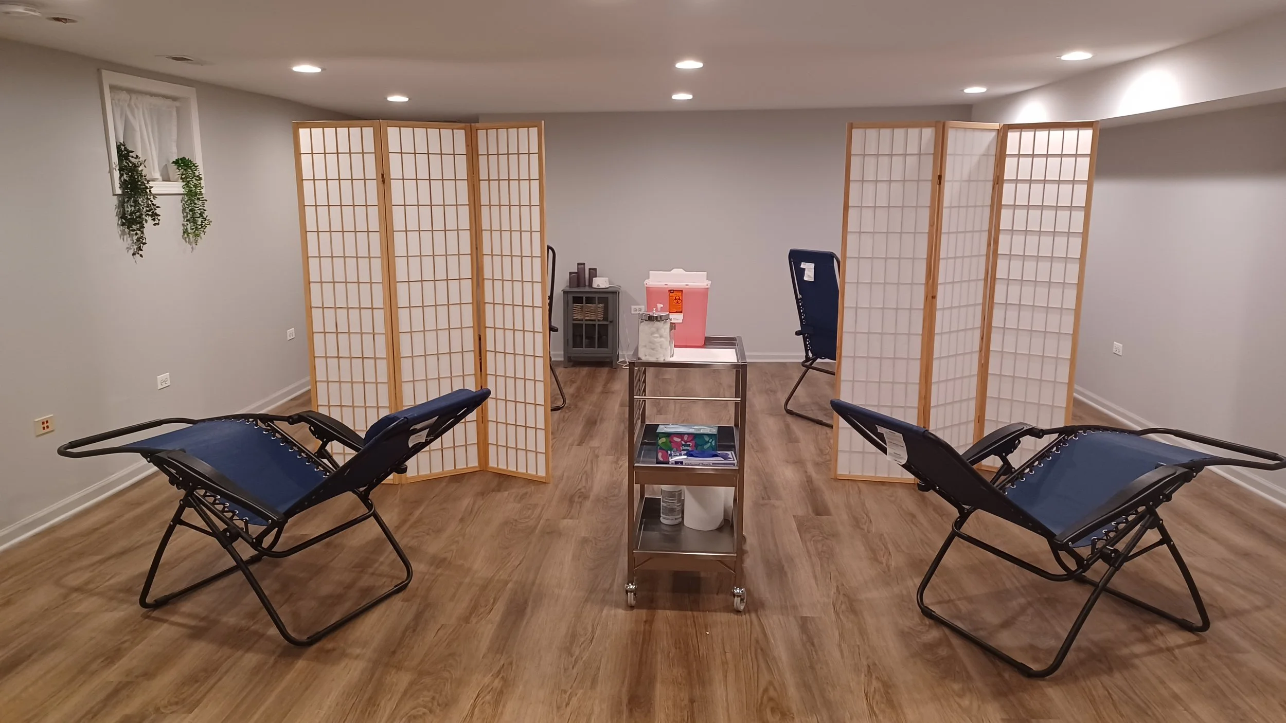Acupuncture treatments are given in a community room alongside other patients in comfortable zero gravity chairs. You will receive a thorough consultation followed by plenty of time for rest, relaxation and healing. Soothing music, white noise machines, and screen dividers offer a semi-private environment. Needles are placed in points on the arms and legs and if indicated, the scalp, ears, and abdomen.